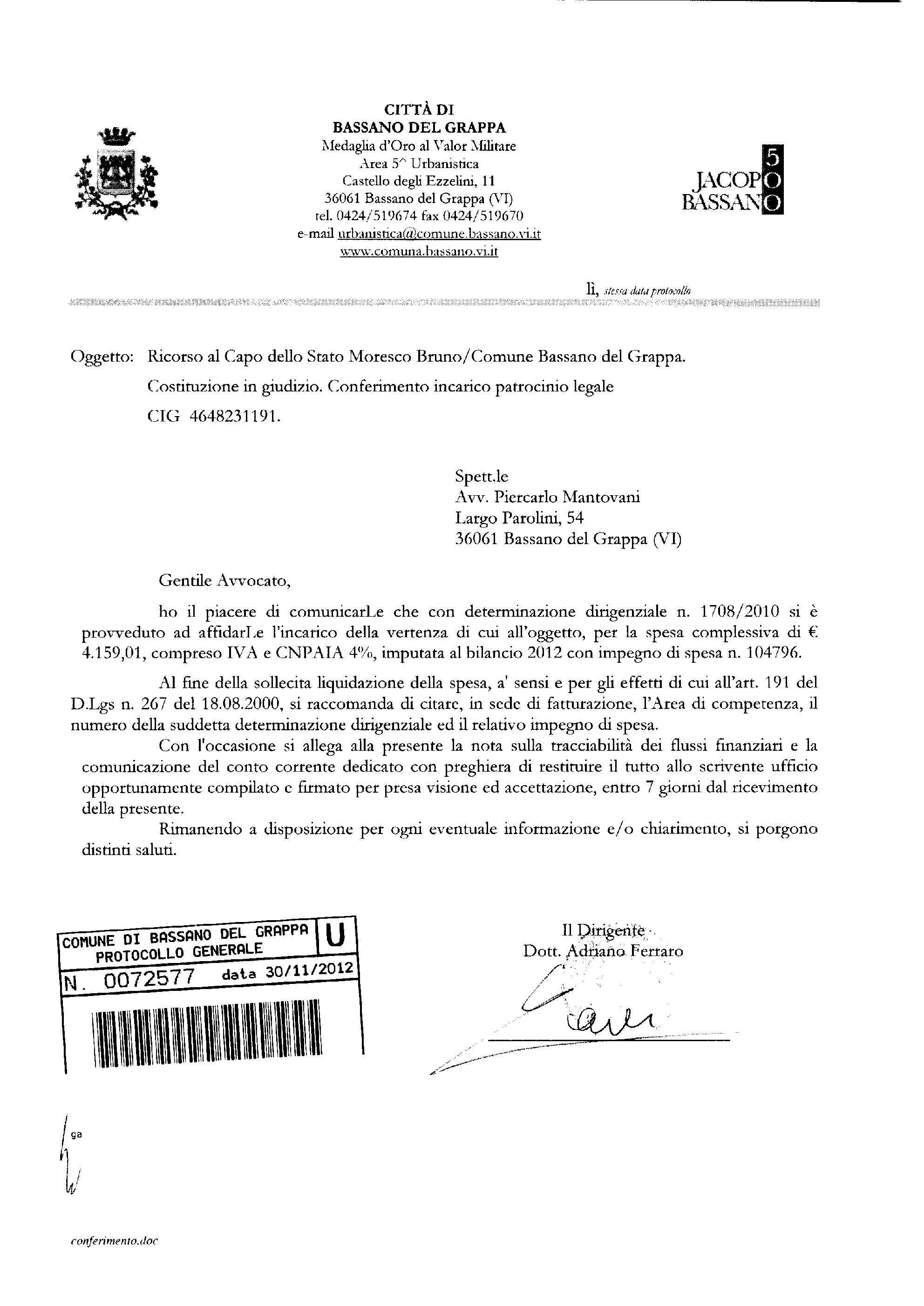 RICORSO AL CAPO DELLO STATO MORESCO BRUNO/COMUNE BASSANO DEL GRAPPA. COSTITUZIONE IN GIUDIZIO. CONFERIMENTO INCARICO PATROCINIO LEGALE ALL'AVV. PIERCARLO MANTOVANI.
